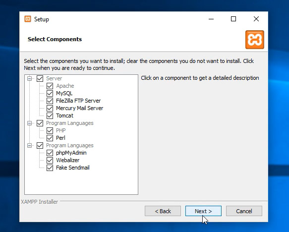 In questa schermata Xampp ci chiede quali componenti installare. Non tutti sono obbligatori per far funzionare wordpress, quelli richiesti sono Apache, Mysql, Php, PhpMyAdmin. Gli altri sono opzionali.