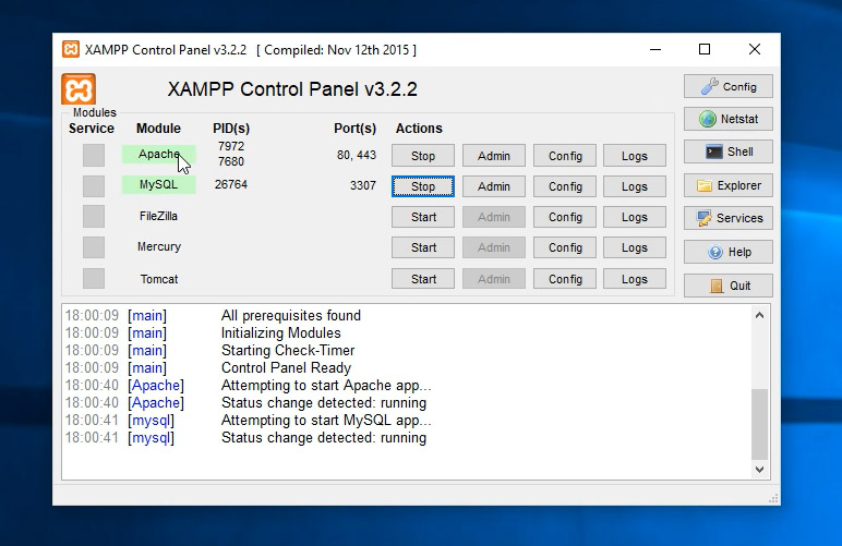 Sulla sinistra del pannello di controllo troviamo alcuni moduli che abbiamo installato. Per far funzionare wordpress abbiamo bisogno che i moduli Apache e Mysql siano attivi. Per attivarli basta cliccare sul pulsante "start" del relativo modulo. Se tutto funziona correttamente la scritta dei due moduli dovrebbe diventare colorata di verde chiaro. Questo significa che il modulo si è attivato con successo (nel caso questo non accada scrivete nei commenti l'errore che ricevete e vedrò di aiutarvi).